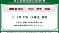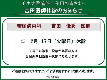 日頃より壬生大路病院をご愛顧いただきありがとうございます。2026年2月17日(火曜日)吉田外来・終日休診上記日、吉田外来は休診とさせていただきます。なお、投薬、処方が必要な患者様に関しましては、当日の外来担当医が診療いたします。ご迷惑を...