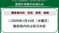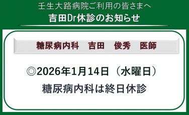 未分類 吉田糖尿病内科外来・休診日のお知らせ 日頃より壬生大路病院をご愛顧いただきありがとうございます。2026年1月14日(水曜日)吉田外来・終日休診上記日、吉田外来は休診とさせていただきます。なお、投薬、処方が必要な患者様に関しましては、内科・小杉医師が担当いたします。ご迷惑をお... 2026.01.06 未分類