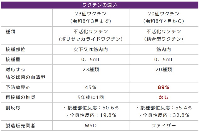 令和8年4月1日から高齢者肺炎球菌の定期予防接種に使用するワクチンが現在の23価肺炎球菌ワクチン(ニューモバックスNP)から、20価肺炎球菌ワクチン(プレベナー20)に変更される予定です。