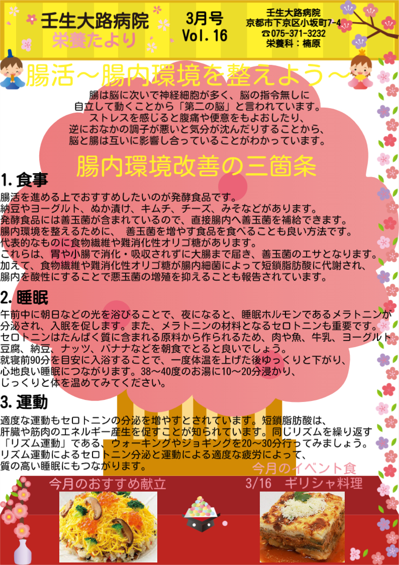 3月・栄養たよりのご紹介 未分類 2026.03.03 日頃よりお世話になっております。壬生大路病院、栄養科です。3月は季節の変わり目😊季節の変わり目に腸活で腸内環境を整えるのはいかがですか?😀栄養たより3月号は「腸内環境改善の三箇条」がテーマです😊是非、ご一読下さい。栄養たより・3月号バックナンバー 今後も壬生大路病院をよろしくお願いいたします。