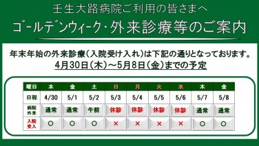日頃より壬生大路病院をご愛顧いただき誠にありがとうございます。ゴールデンウィーク期間は上記の通りです。面会に関しましては、14:00~16:00(最終受付16:30)で毎日可能です。詳しくは下記リンクよりご確認下さい。面会に関しまして ...